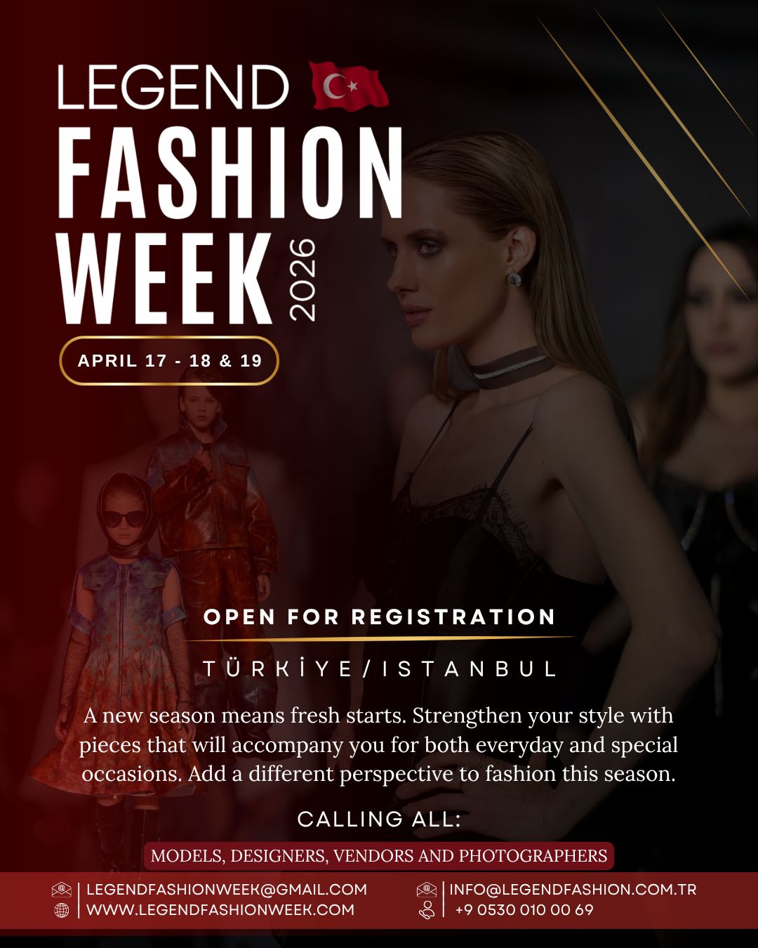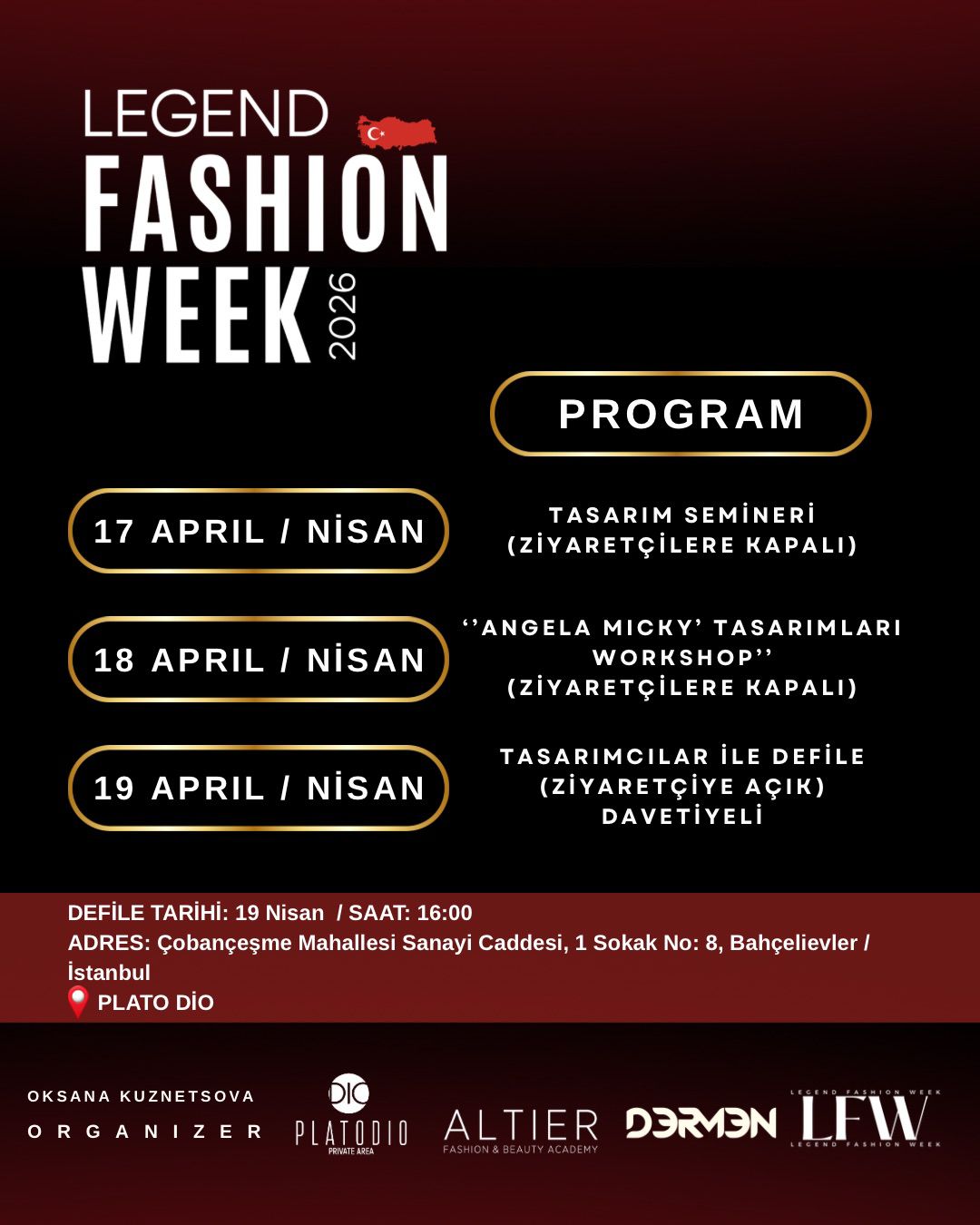 Organizasyonun sahibi ve aynı zamanda Legend Fashion Magazine’in kurucusu Oksana Kuznetsova öncülüğünde gerçekleşen etkinlik, dünyanın dört bir yanından gelen tasarımcıları, modelleri ve moda profesyonellerini aynı çatı altında buluşturuyor.